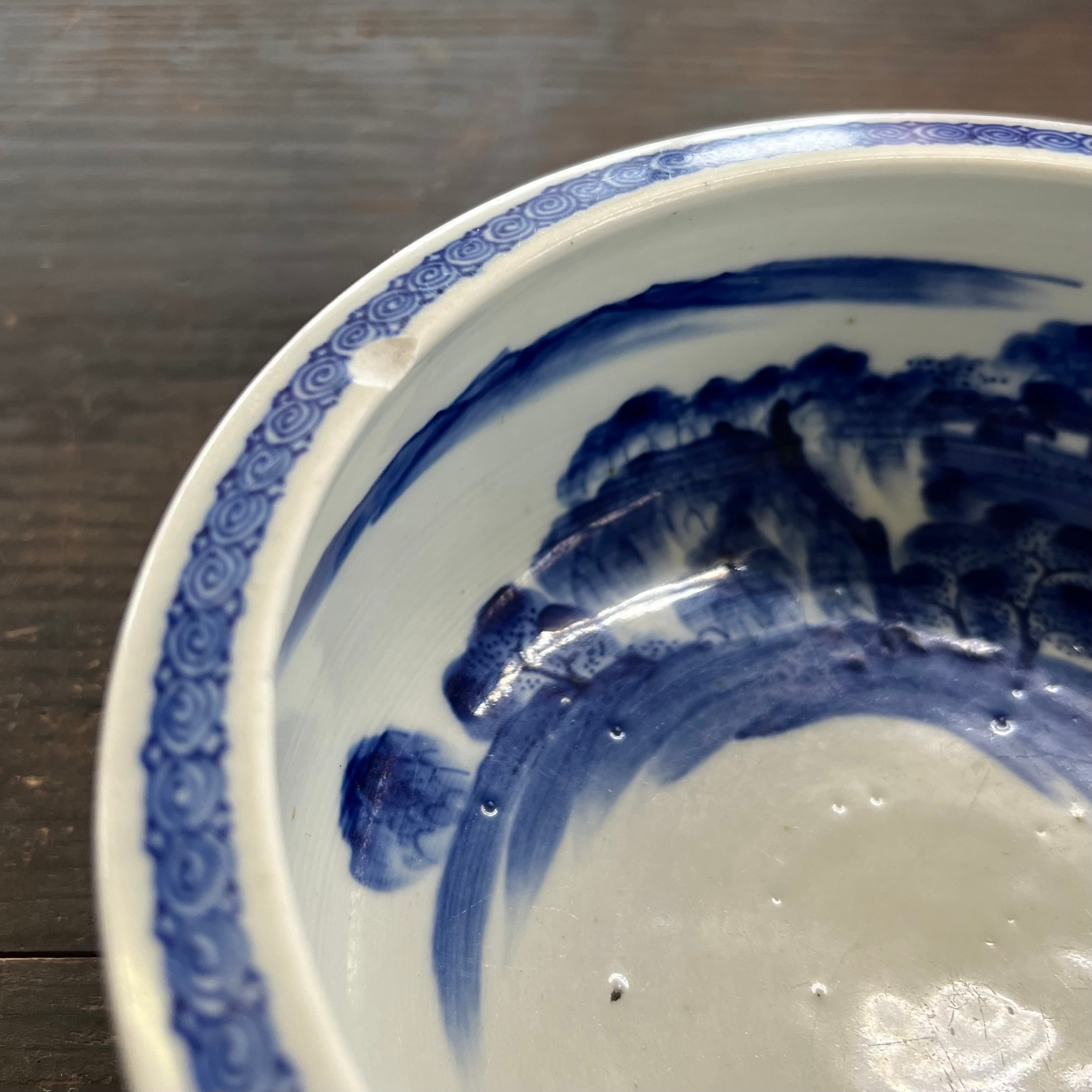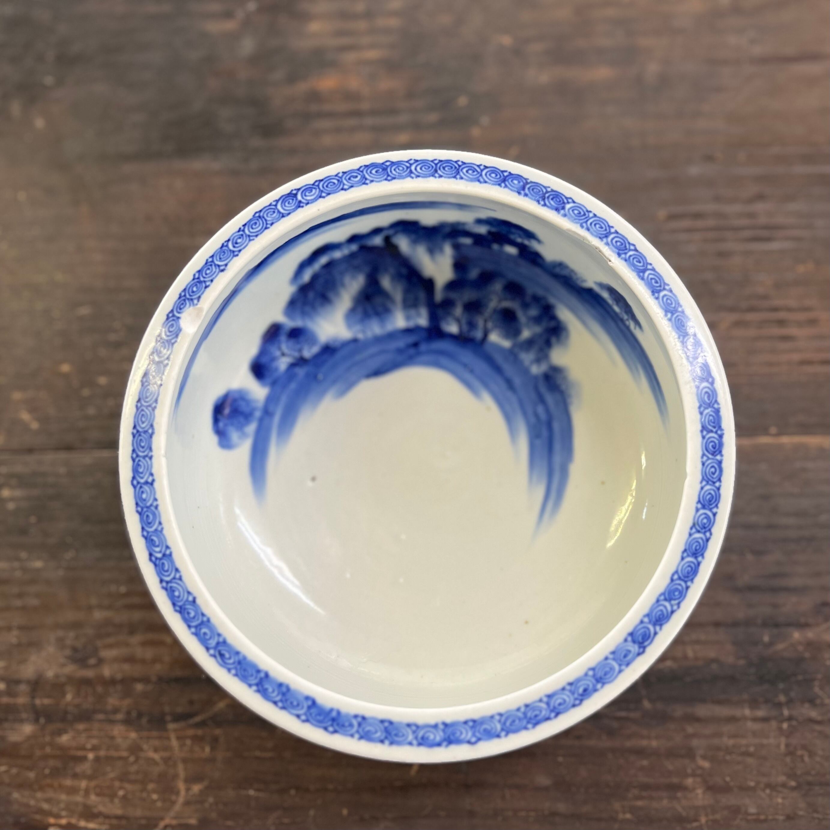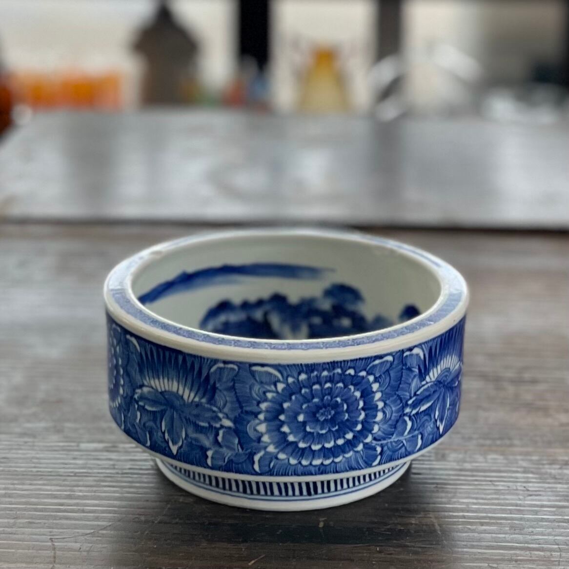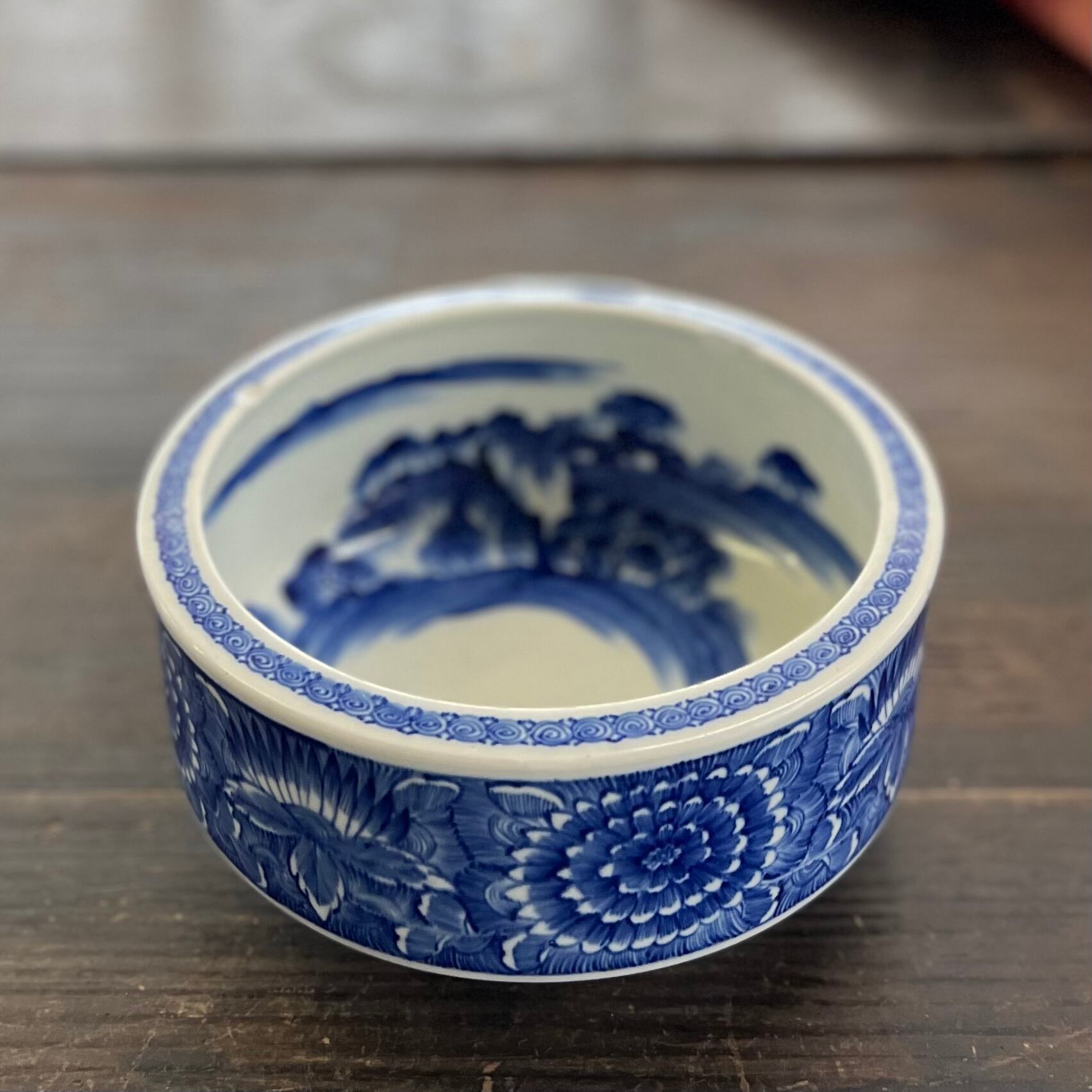 外側の花模様と、内側の風景画がきれいな深めの器。